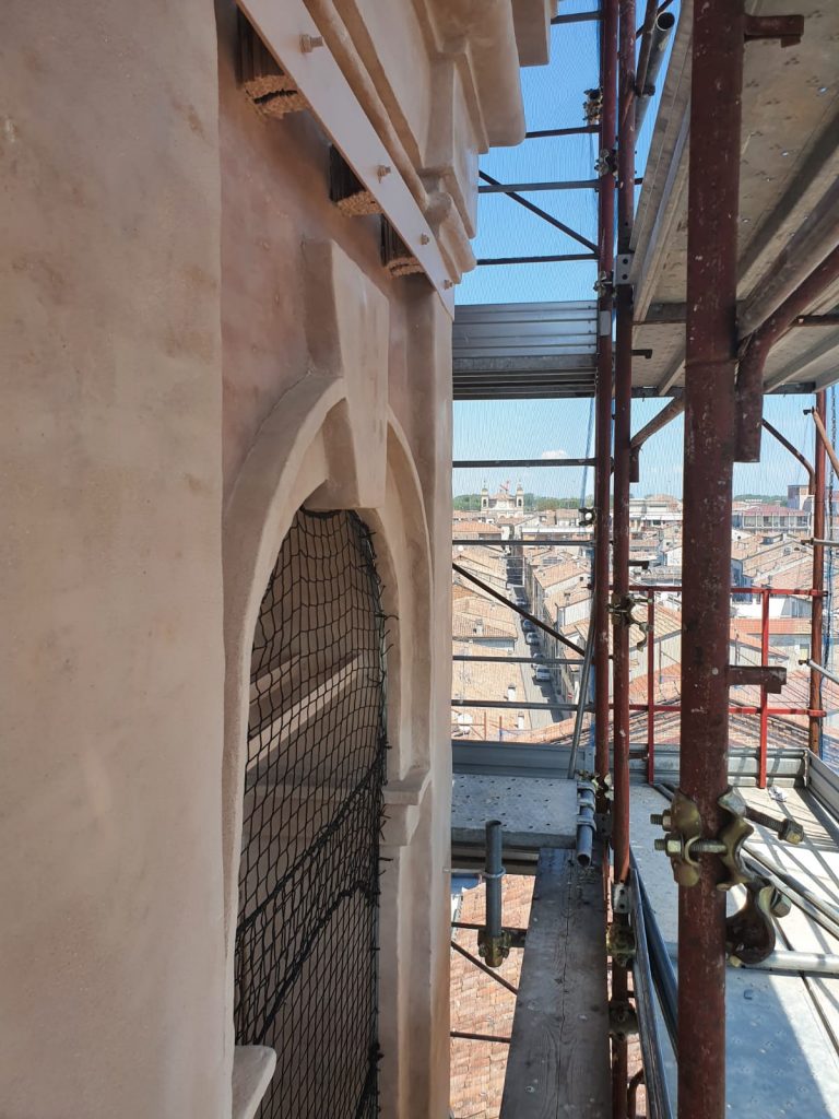 Risanamento del campanile: Pulitura delle parti danneggiate con l’eliminazione di intonaci cementizi e l’applicazione di sagramatura a calce per risanare le parti deteriorate.
